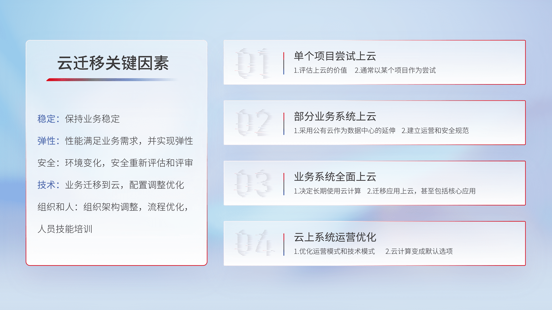 结合实际业务,,从规划设计、、、云平台选型、、云原生改造、、、数据迁移、、、集成交付,,,,迁移全过程为客户识别最佳上云路径,,,,做好风险识别管理,,设计网络架构、、、、身份权限、、、、安全审计合规、、操作审计、、日志审计、、、监控告警策略、、、多站点容灾设计等,,对云上基础设施进行整体规划,,,提升IT治理水平,,,以满足弹性、、、、高可用、、、、高性能的需求。。。。