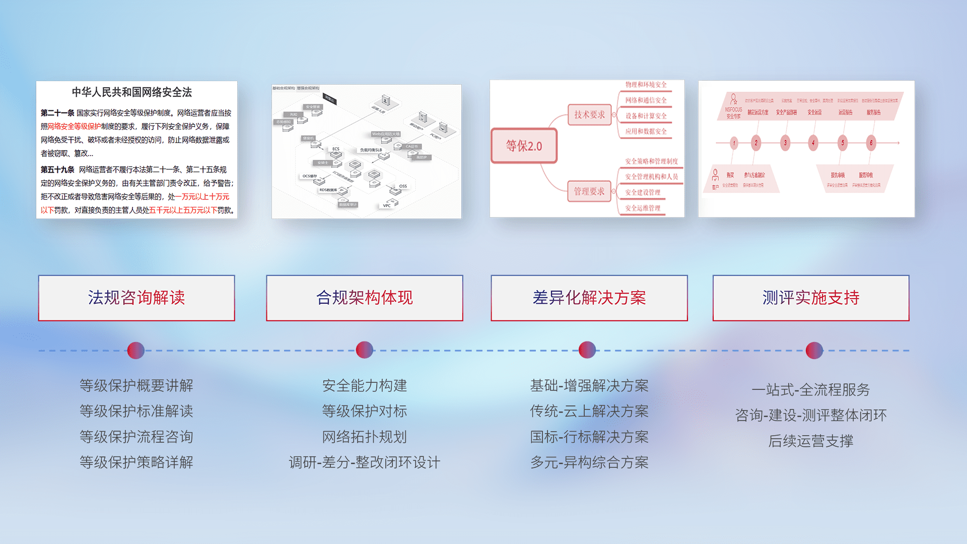 通过专业的法律咨询解读、、、合规架构体现、、、差异化解决方案、、测试实施支持等服务,,,,为客户量身打造等保合规体系。。